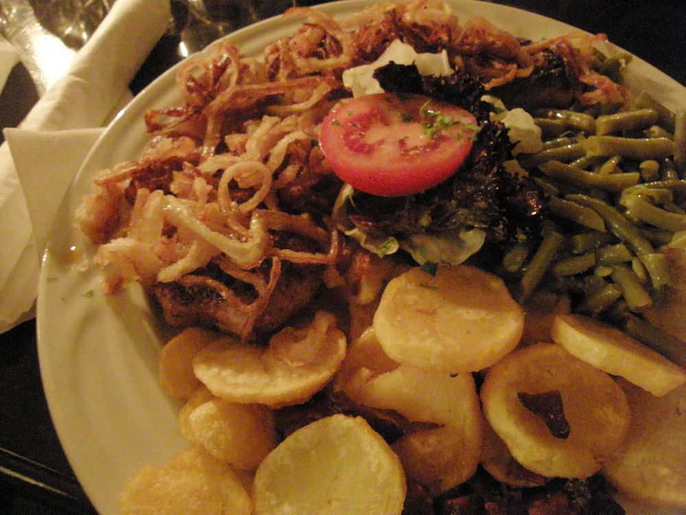Foodwise I opted for nothing less than a Bauernkotelett (farmer’s cutlet), which consisted of tender grilled pork, covered in loads of roasted onions, with fried potatoes, little cubes of bacon and pole beans on the side:
