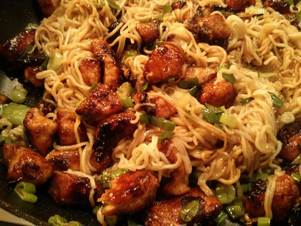 Cut up three to four scallions and a few chicken breasts. Throw the white part of the scallions into a wok or a similar kind of pan, with a bit of oil. Heat them up on medium until they look ready (that’s usually when they look slightly translucent).
