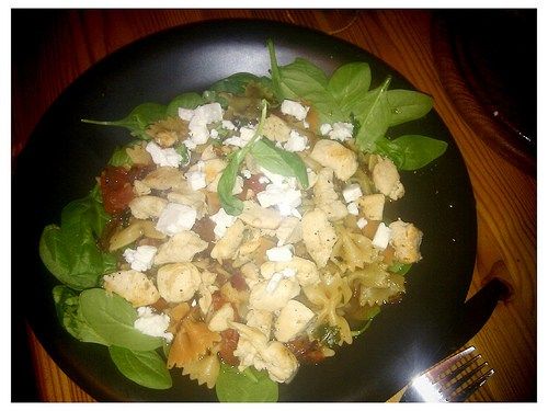 Well, I made Farfalle with caramelized onions, fresh basil, fresh spinach, fresh tomatoes and roasted pieces of chicken. You may not have noticed, but yeah, the main ingredient is FRESH!