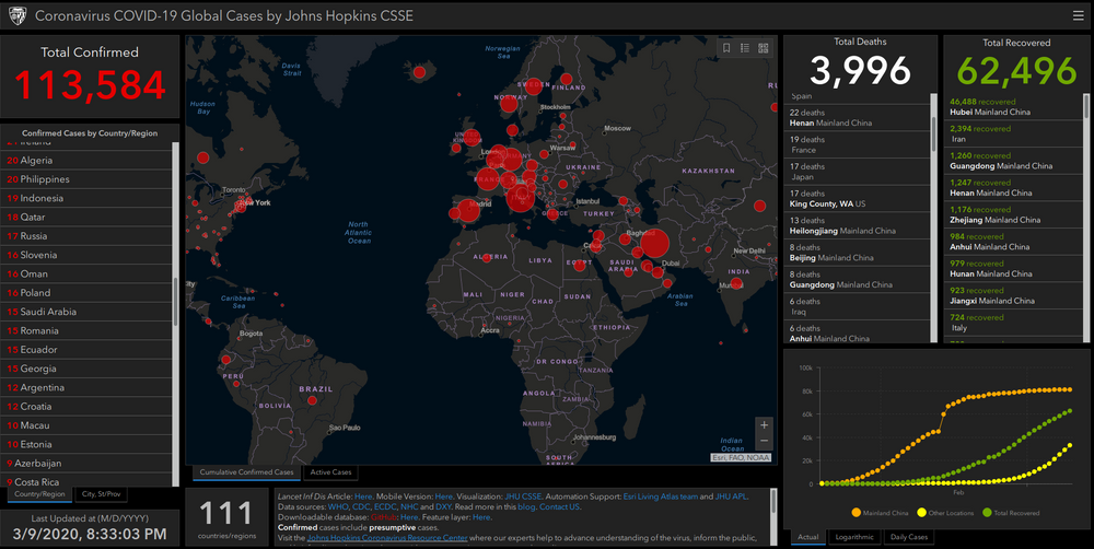 Johns Hopkins university has a great dashboard giving a global overview of Corona virus infections. It's for desktop and mobile and everyone who wants to keep tabs on things should go ahead and bookmark it (do people still bookmark things?).