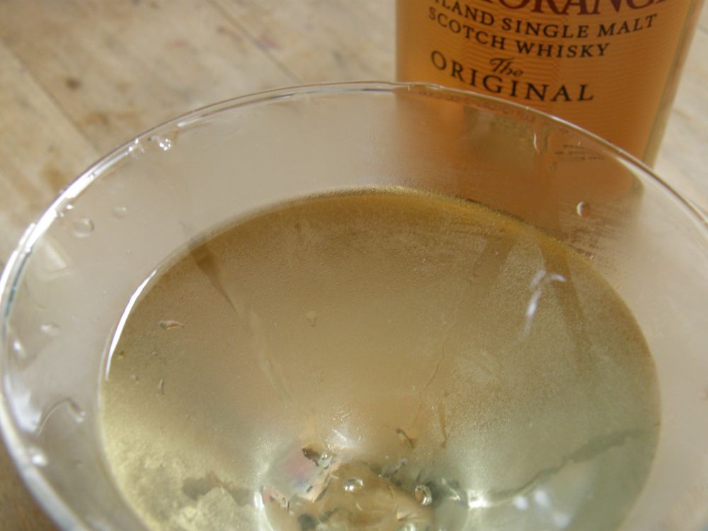 What you see is a variant of the Dusty Martini. While the original Dusty substitutes Vermouth with Scotch, I added the Scotch after mixing a 2:1 Dry Martini. The effect was a Martini that had lost most of its bitter edge and instead had most of the sweet Scotch flavour.