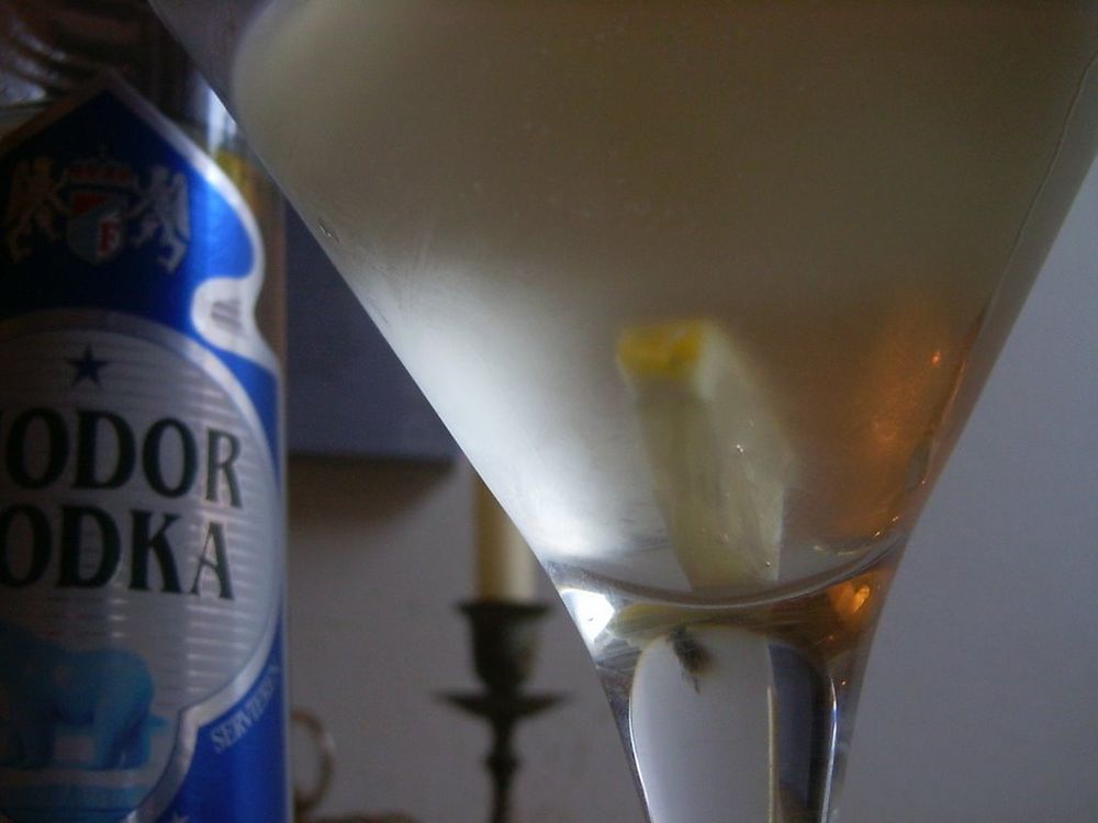 I prepared the Martini as I had done with the first one, but instead of Gin, I used 4 parts of Vodka. Instead of an olive, a lemon was cut up and a wedge put into the chilled glass before pouring.