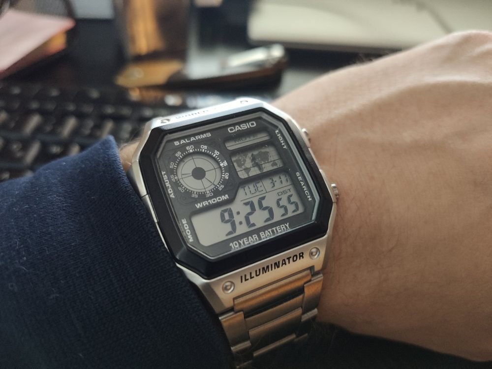 It's a Casio AE-1200WHD 1AVEF, a fun, inexpensive watch that has garnered a bit of a following for the fact that it closely resembles a far rarer and more famous watch: the Seiko G757. A watch that today goes for about €5.000, if you happen to find one. The reason this watch is as famous as it is lies in the fact that it was worn by one James Bond, in a film called "Octopussy".